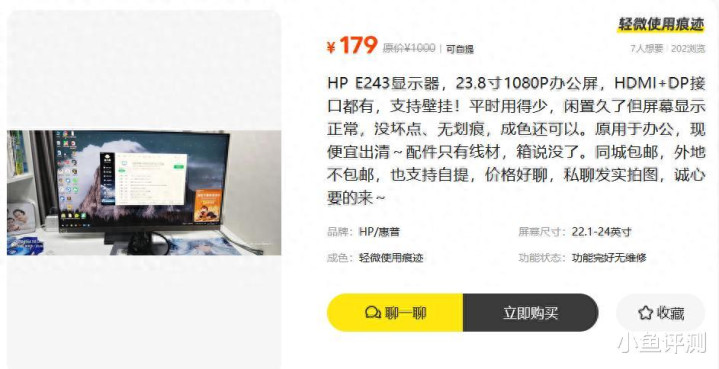 现在给电脑添块副屏,成本到底有多低?一杯精品咖啡的钱,可能就够了。最近在二手刷到一位个人卖家在出 HP E243 显示器,标价 179 元。23.8英寸1080P,VGA、HDMI、DP全接口,支持壁挂。卖家说用得少、没坏点、无划痕,成色“还可以”,这价格和配置,说实话真不贵。