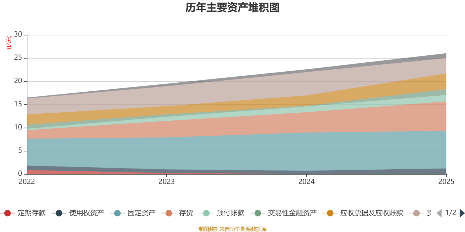 资产重大变化方面,截至2025年12月,公司货币资金较上期末减少33.85%,占公司总资产比重下降9.52个百分点;固定资产较上期末减少1.49%,占公司总资产比重下降5.35个百分点;存货较上期末增加44.73%,占公司总资产比重上升4.93个百分点;交易性金融资产较上期末增加1010.99%,占公司总资产比重上升4.34个百分点。
