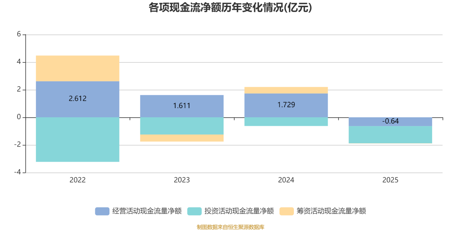 2025年,公司经营活动现金流净额为-6397.7万元,同比减少2.37亿元;筹资活动现金流净额-154万元,同比减少4838.6万元;投资活动现金流净额-1.24亿元,上年同期为-6305.6万元。